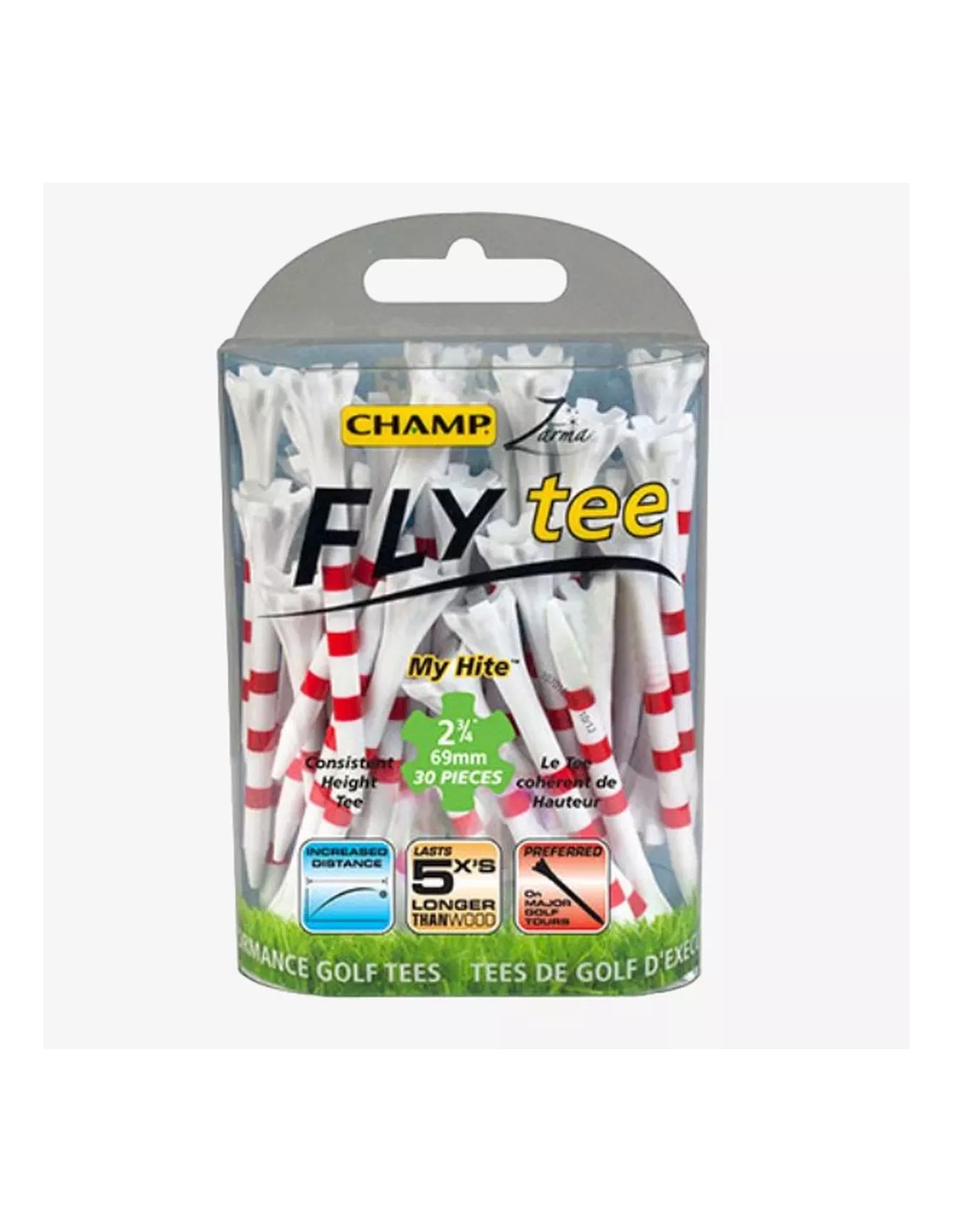 69 mm Champ Zarma Fly tees. Dispone una cabeza baja, lo que produce menos fricción, más distancia y más precisión. El diseño de la cabeza delantera mejora la estabilidad y la colocación de la bola. Gran resistencia y durabilidad. Diseño de plástico biodegradable.