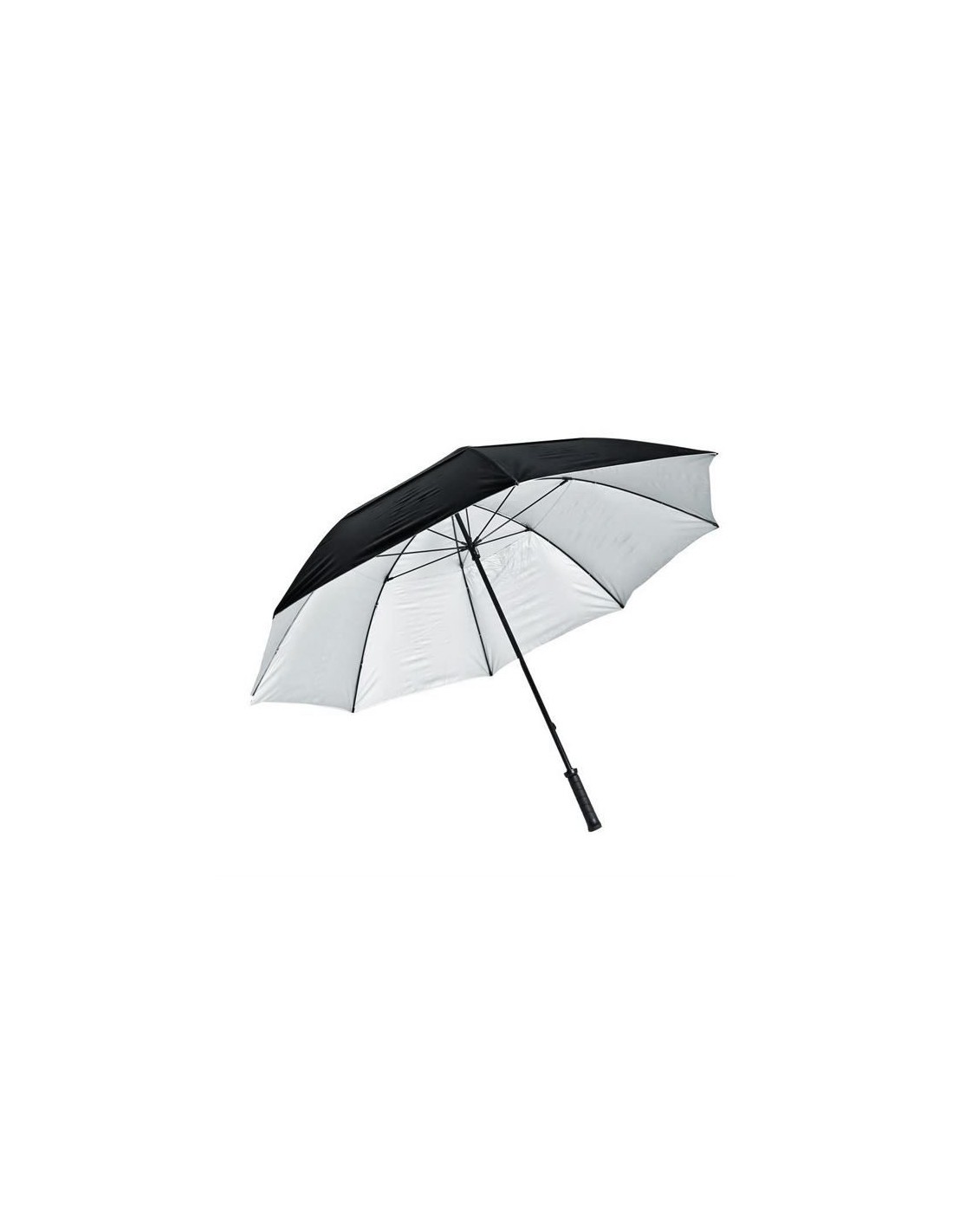 Paraguas a prueba de viento, gran tamaño, con 62 de diametro. Material duradero del Polypongee con protección ULTRAVIOLETA y forro en color plata. Reduce los rayos UV dañinos. Regálate sombra en la época mas calurosa y garantizate protección de los rayos. Varilla de fibra de vidrio y mango de goma. Negro / Plata.