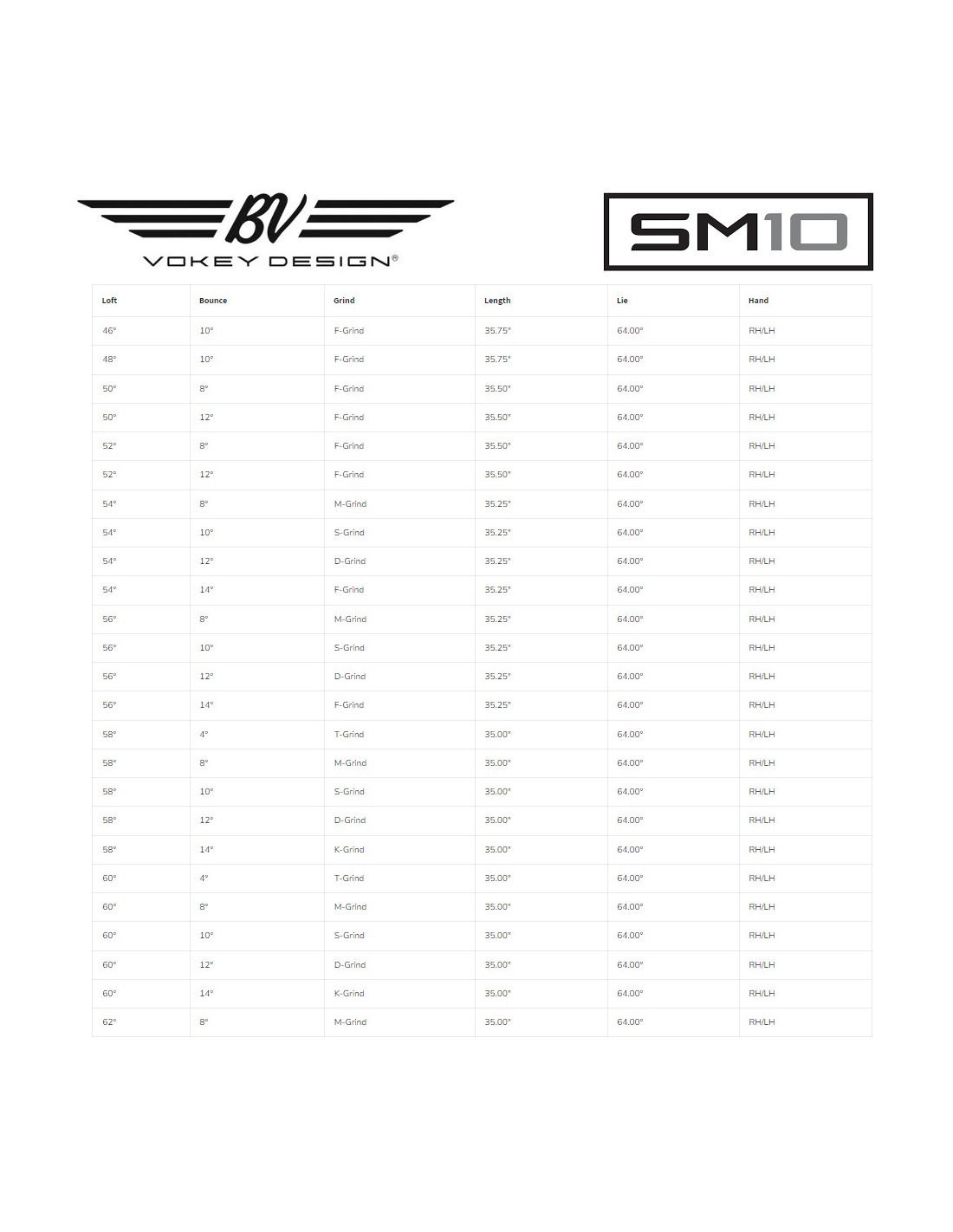- Versatilidad de tiro: La familia Vokey Design SM10 comprende seis diferentes tipos de suela probados en el circuito (F, S, M, K, T y D), con un total de 25 combinaciones únicas de loft, rebote y grind, lo que permite a cada golfista la oportunidad de encontrar su configuración óptima del wedge. Los wedges correctamente ajustados que complementan el tipo de swing del golfista y las condiciones del campo ayudan a desbloquear la creatividad alrededor de los greens y a lograr una interacción y un contacto adecuados con el césped.